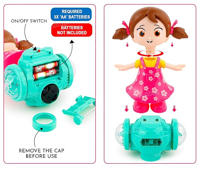 - π EASY TO OPERATE WITH BATTERY-POWERED DESIGN: This dancing toy operates with three AA batteries (not included), making it easy for parents to set up. Just switch it on, and watch as the girl dances with stunning light effects and playful music, keeping your child engaged in active, imaginative play.