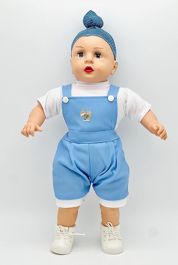 - Cute Baby Doll with full soft body for kids with movable arms, legs and Eyes. life-like eyes and hair , Minimum age: 2 years. Material: Non Toxic PVC, Cotton inside the body